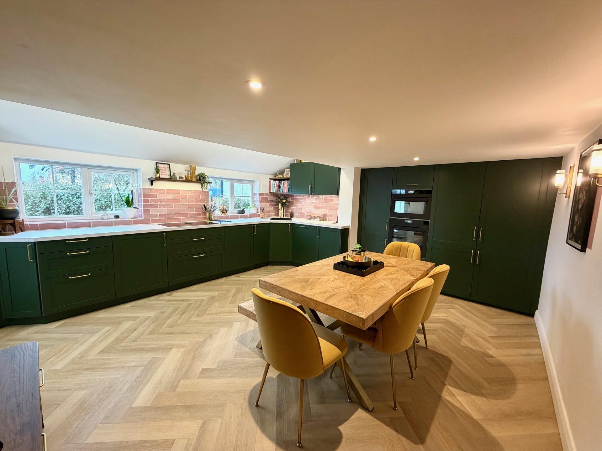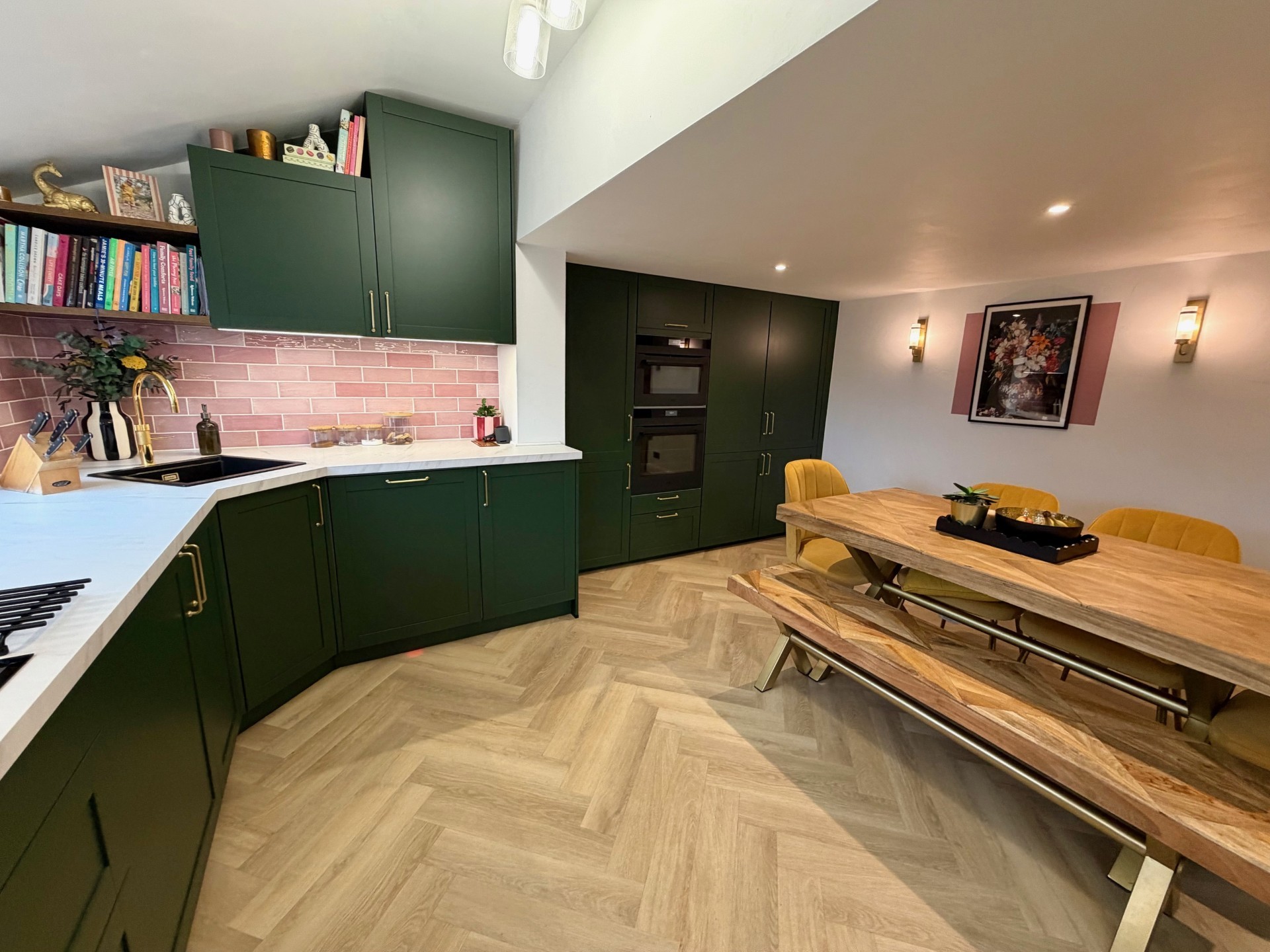 “We wanted a kitchen that truly felt like the heart of our home — somewhere we can cook, eat, work, and spend time together without feeling on top of each other. With young children, it had to be practical and hard-wearing, but we didn’t want to compromise on style. We love colour and warmth, so the deep green cabinetry and pink tiles give it personality while still feeling timeless. Storage was really important to us because family life comes with a lot of ‘stuff’, and we wanted everything to have its place so the space always feels calm and uncluttered. The big table is a must — it’s where we eat every day, the kids do homework and crafts, and where friends gather when we’re entertaining. We also wanted the layout to feel open and sociable so one of us can cook while still being part of what’s going on. Good lighting, durable surfaces, and easy-to-clean finishes were key for day-to-day life. Most of all, we wanted a space that feels warm, welcoming, and grown-up but still fun for our young family — somewhere we’ll make memories for years to come.”