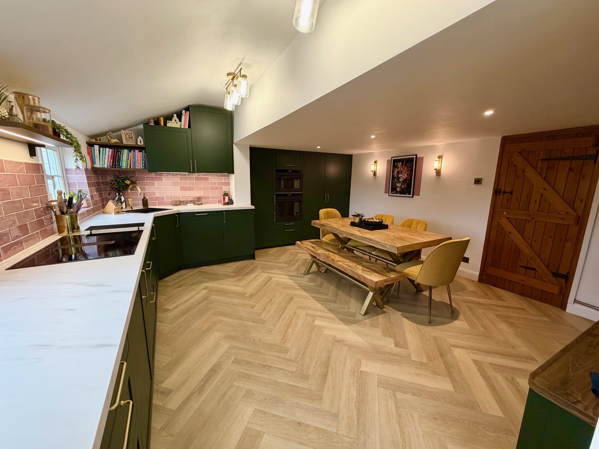 This project involved the complete redesign and installation of a family kitchen to improve functionality, circulation, and visual cohesion within an open-plan kitchen–dining space. A key design challenge was the original position of the hob, which had been located directly beneath the window. This created practical and safety issues, restricted usable worktop space, and prevented the installation of an effective extraction system. Due to the sloping ceiling and limited ceiling void, a conventional overhead extractor was not feasible. To resolve this, the cooking zone was relocated to a new position within the main run of cabinetry, allowing for a more ergonomic layout, improved workflow, and increased uninterrupted preparation space. A venting induction hob with integrated extraction was specified. This eliminated the need for a ceiling-mounted or wall-mounted extractor while still providing efficient air recirculation and maintaining clear sightlines across the room — an important requirement for the clients’ family lifestyle. The revised layout also enabled: A full-height bank of tall cabinetry housing integrated appliances and pantry storage Continuous work surfaces for food preparation and baking Improved zoning between cooking and dining areas The installation included bespoke cabinetry in a deep green finish, German Laminate worktops, a tiled splashback, integrated appliances, and a new lighting scheme designed to work with the reduced ceiling height. The result is a highly functional, family-friendly kitchen that overcomes structural constraints through thoughtful space planning and carefully selected appliances, while delivering a warm, contemporary aesthetic.